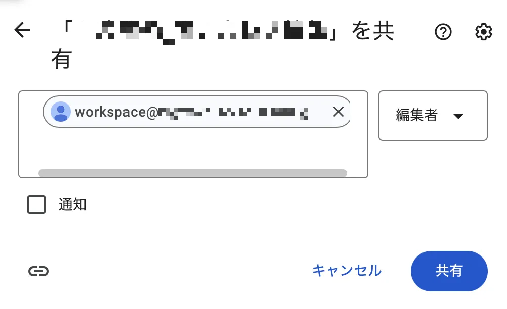 サービスアカウントがスプレッドシートを利用できるように権限を付与します。書き込みが必要な場合は「編集」権限を付与しておきましょう。