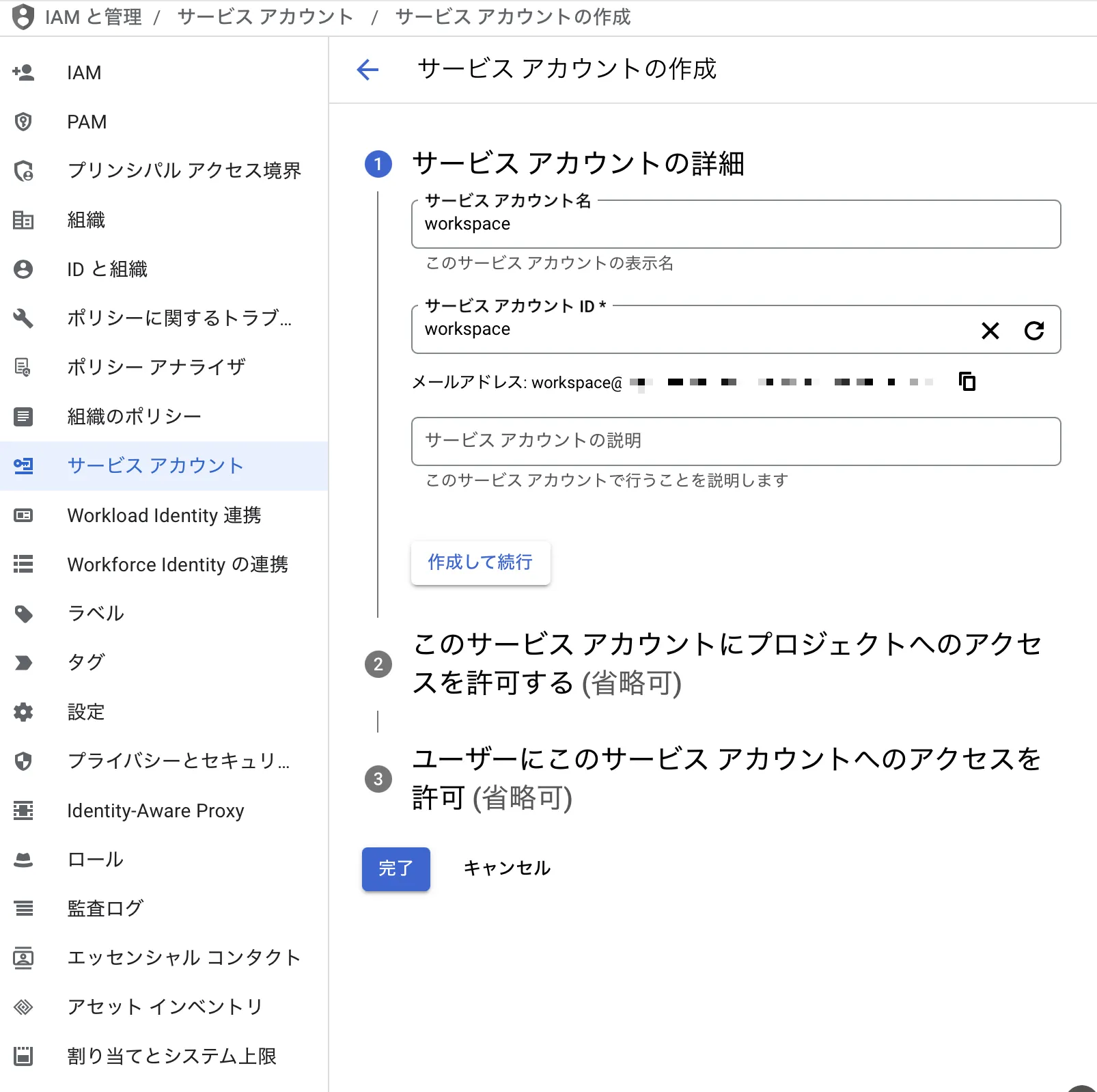 「IAMと管理」>「サービスアカウント」の画面から作成ボタンを押し、お好みのサービスアカウント名を設定します。終わったら「完了」を押しましょう。