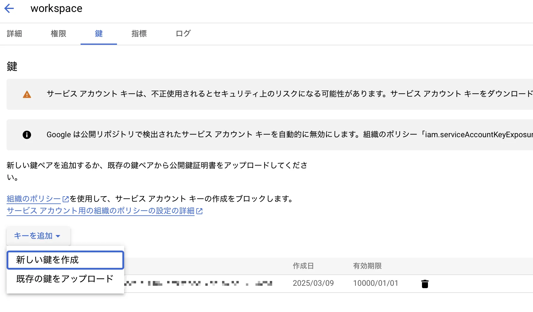 作成したサービスアカウントの詳細画面を開き、「鍵」のタブを表示させたら「キーを追加」>「新しい鍵を作成」を選択します。