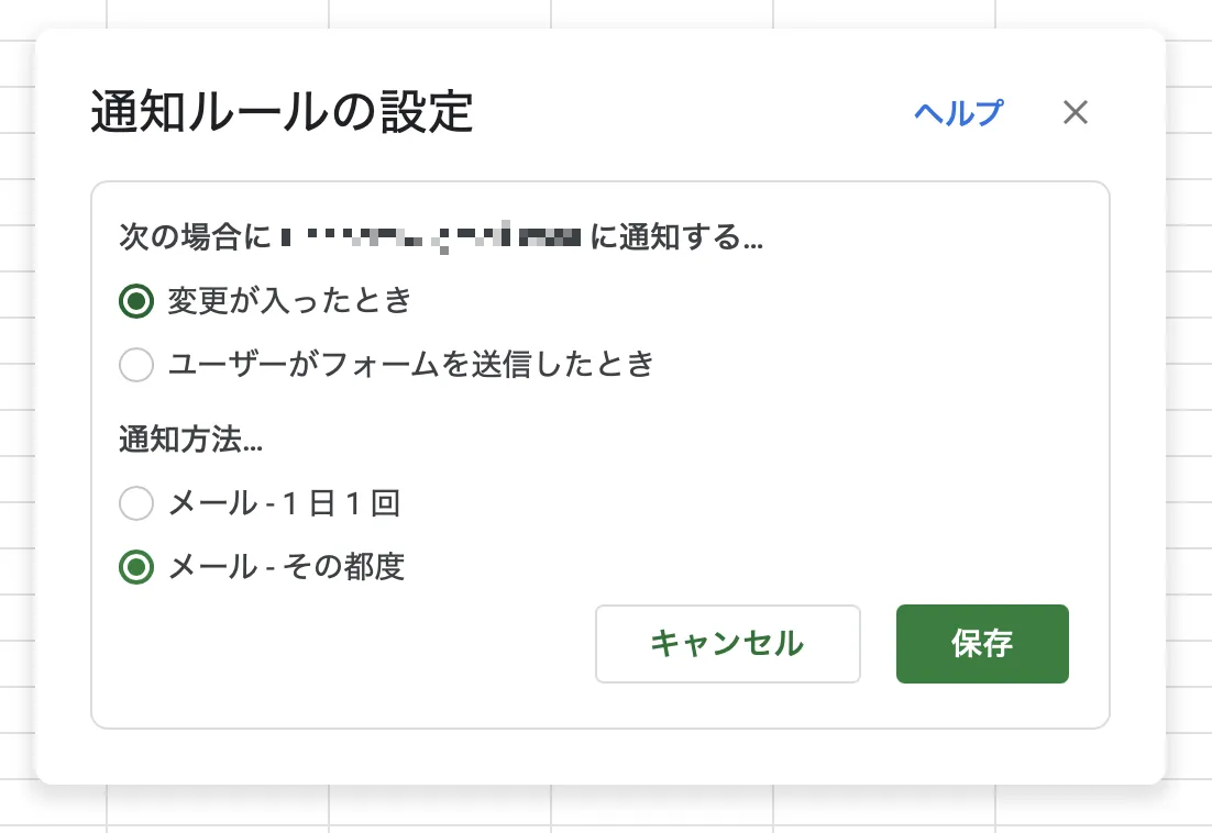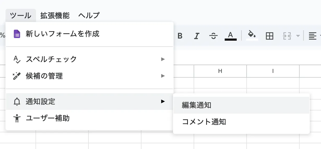 スプレッドシートのメニューから「ツール」>「通知設定」>「編集通知」を選択します。
