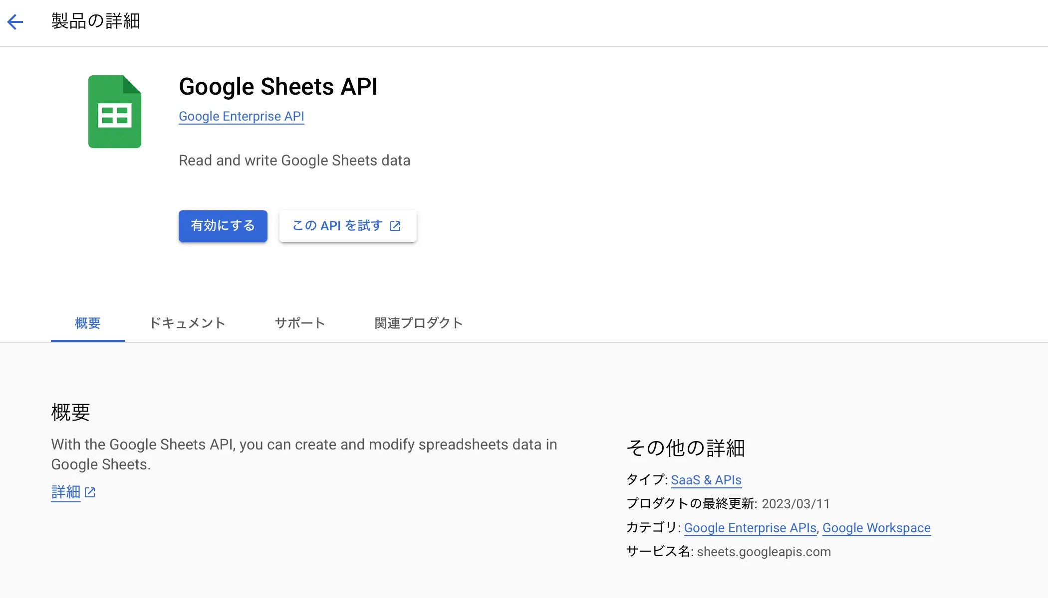 その後は「Google Drive API」と「Google Sheets API」を検索し、それぞれ「有効にする」を押しましょう。