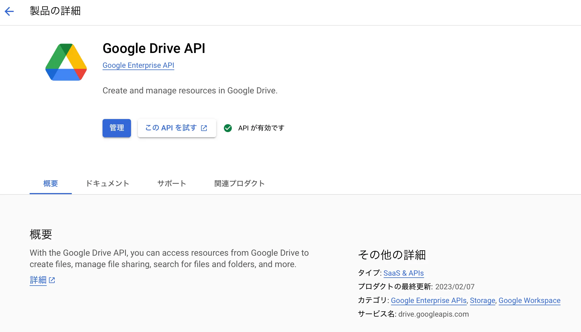 以下はDrive APIの方。すでに有効にした後の画像です。