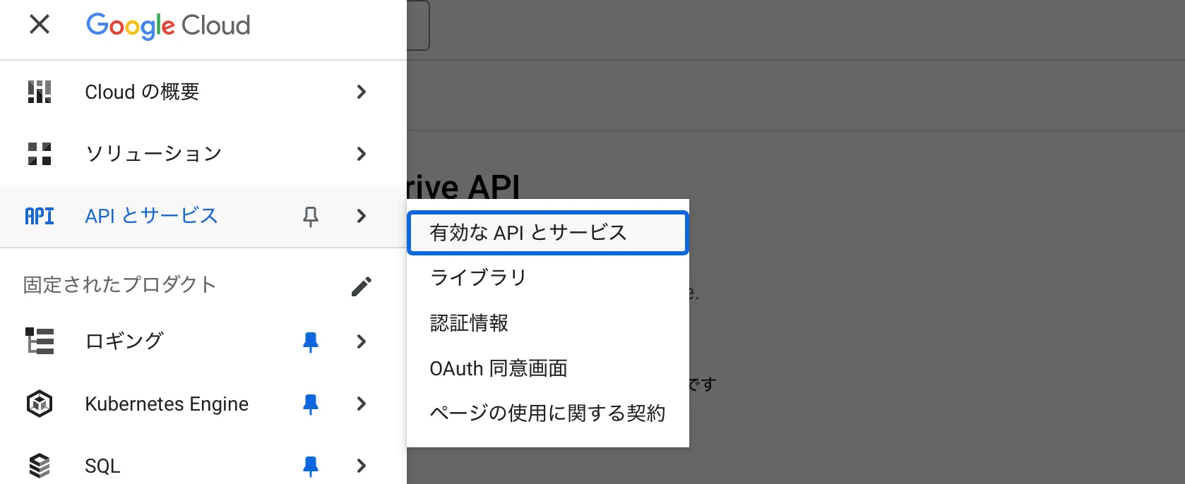 Google Cloudでプロジェクトを作成後、サイドメニューから「APIとサービス」>「有効なAPIとサービス」を選択します。
