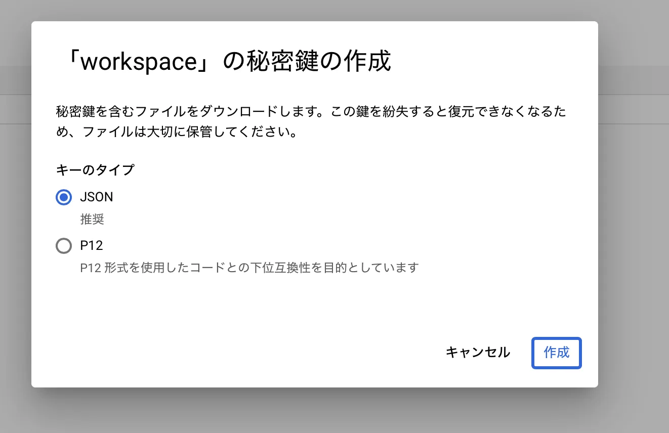 特に理由がない場合はJSONでよいと思います。「作成」を押しましょう。これでサービスアカウントの認証情報がローカルにダウンロードされたと思います。